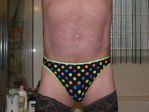 From what I observe, it looks like "Pee-Jay" might use a similar design principle that I use, for my custom-crafteds. He may like his playwares considerably more scimpy than do I, but, his designs look to bee very similar to mine, in that the Front Panels and Back Panels have identical coverage and symmetry to each other, and for that reason, among many, concerning our designs, you really don't need to worry whether you're wearing these "forwards" or "backwards", as they're gonna tickle your "fancy" 'n' bum, just the same.