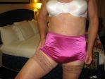 I've been playing for an hour now. Just wearing a white bra, 40c. A pair of hot pink satin panties, stockings and a beige half slip. Getting very ....aroused now. Might be time for a .............break. ; )