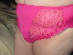 went to Walmart to get some stockings. i really miss wearing my girdle and stockings so i picked up a couple of pair. as i was wandering around i found this bright pink bralette that looked like it would match my Valmont satin/lace hi-cuts. i have a pair in hot pink but couldnt find the matching bra anywhere. hanging right below the bralette was a 2-pack of stretch lace panties so of course i had to get them too!
